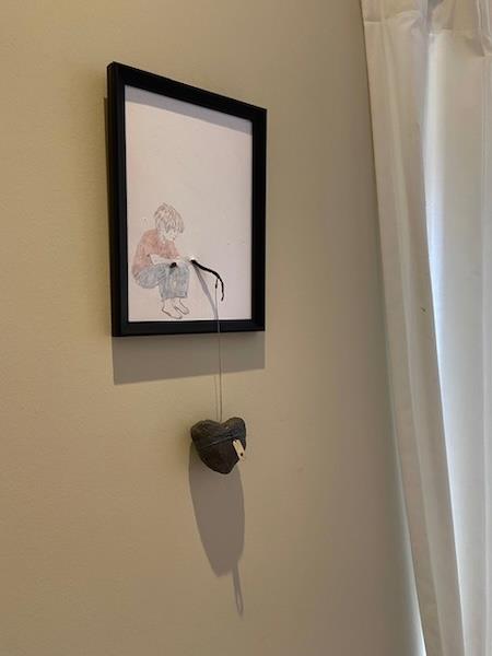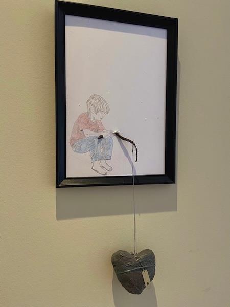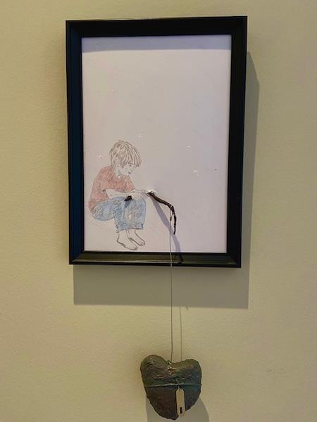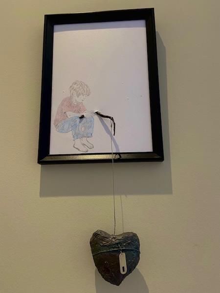 En dreng siddende, som holder en tynd snor, der fører ned til et hjerte placeret udenfor kroppen. Hjertet er ikke skjult, men eksponeret .