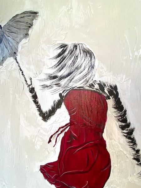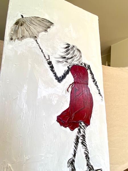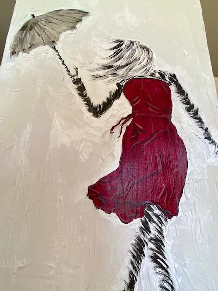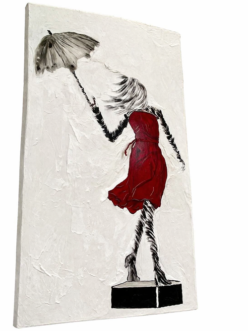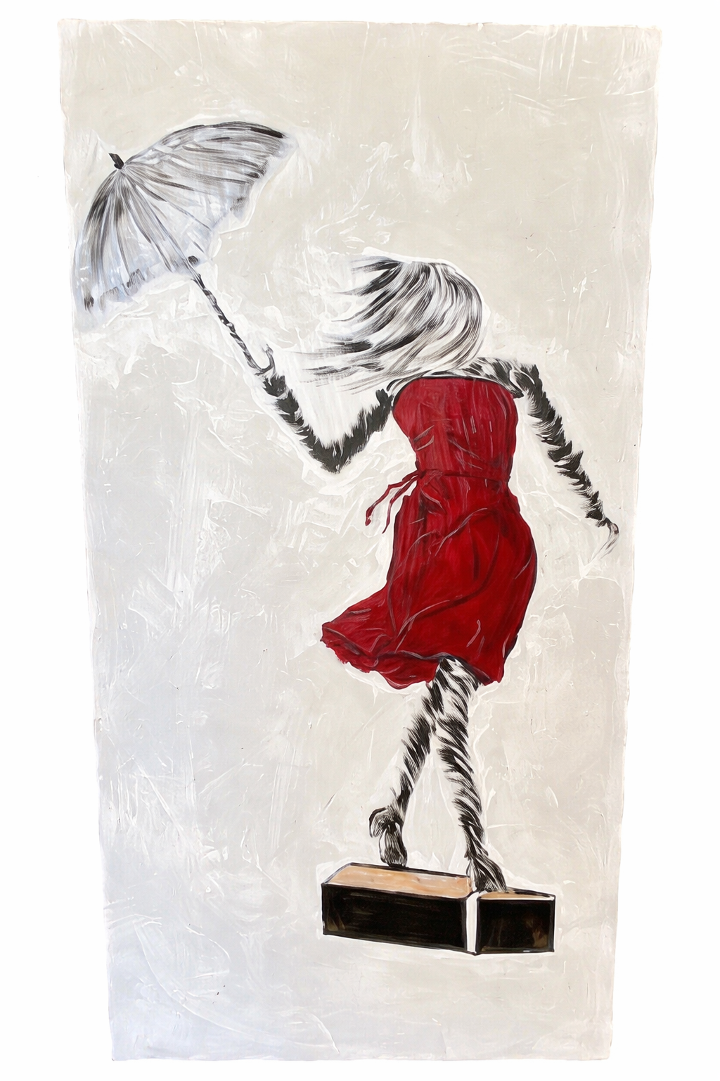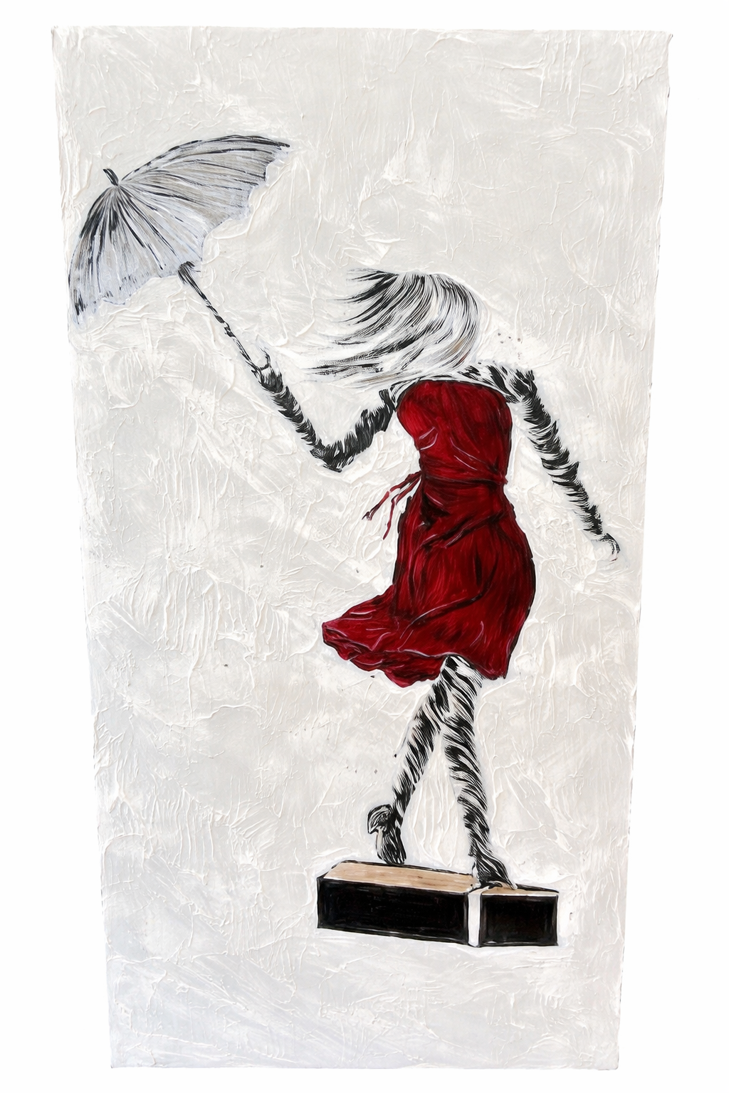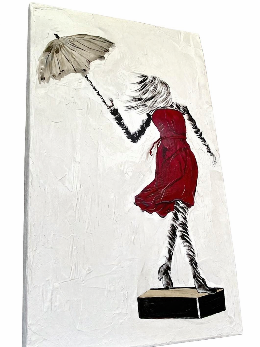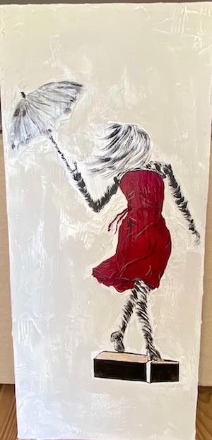 Figuren balancerer på kanten, mens vinden tager fat i både hår, kjole og retning. Paraplyen er ikke længere en beskyttelse – men et symbol på det, vi forsøger at holde fast i, selv når vi mister kontrollen.