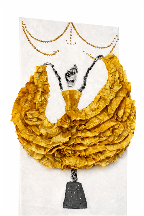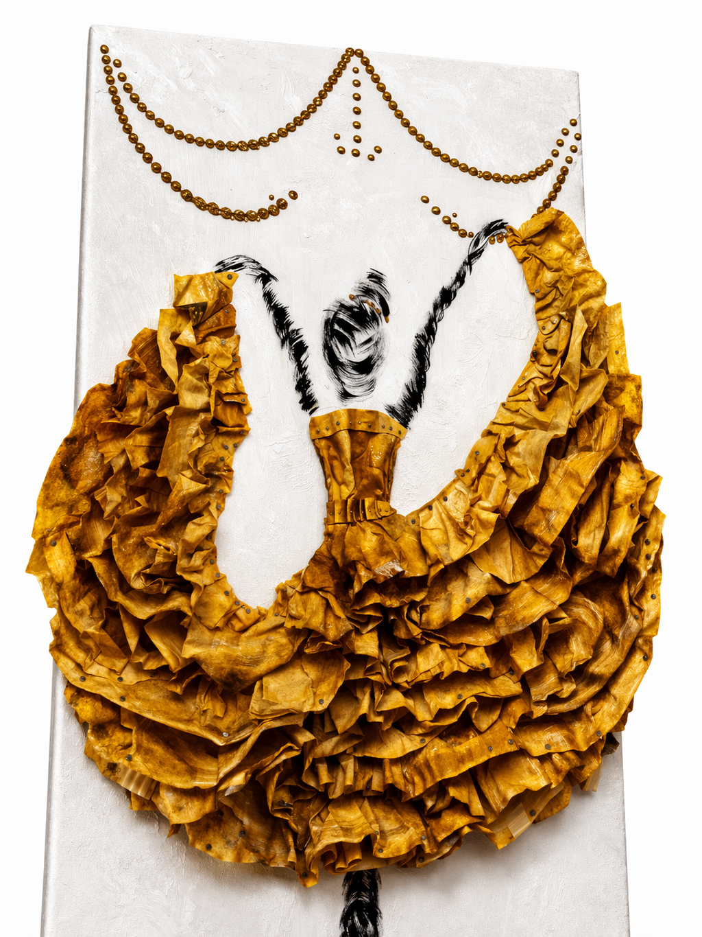 Værket er opbygget i lag af akryl og struktur, hvor den rå overflade skaber kontrast til de bløde, organiske former. Den voluminøse kjole er håndformet i rispapir (mulberry paper), hvis lange fibre giver en levende og naturlig tekstur, som tilfører værket dybde og eksklusivitet.