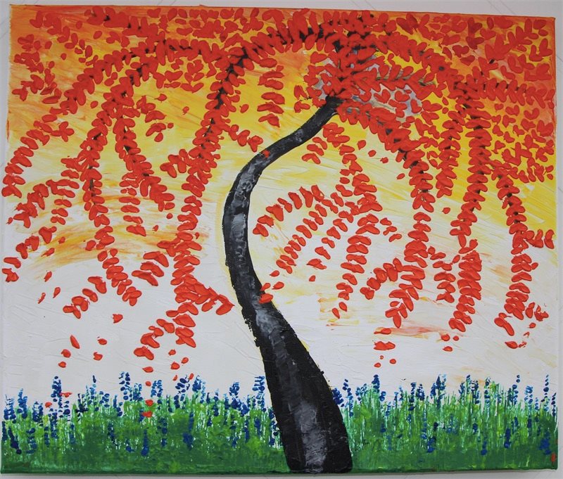 Blomsterne er malet med modellerings Pasta der giver dem et mere levende udtryk og de træder let frem fra lærredet.