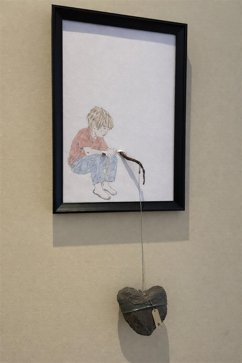 En dreng siddende, som holder en tynd snor, der fører ned til et hjerte placeret udenfor kroppen. Hjertet er ikke skjult, men eksponeret .