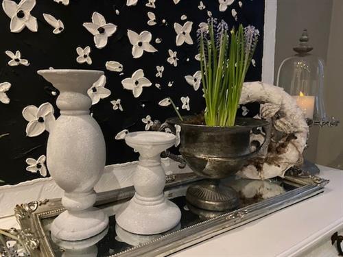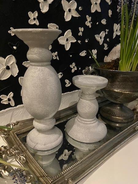 Bring elegance og nordisk ro ind i dit hjem med dette sæt af to eksklusive lysestager i Frosted French Grey. Hver stage er håndmalet med en blød, frosted overflade, der giver et smukt, kalket og let glimtende udtryk – perfekt til både hverdagsstemning og særlige anledninger.