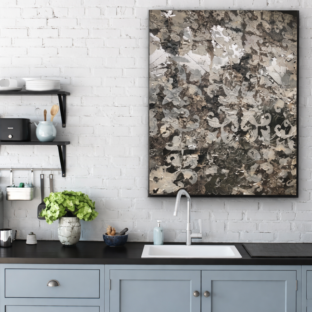 Malingen er opbygget med lag af akryl, sand, plaster og metallisk folie i en smuk sammensmeltning af grå, hvid og sølvfarver. Det skinnende sølvfolie med det hvide mønster ovenpå danner en markant kontrast til det rå, sandblandede plaster – og skaber en levende overflade, der skifter karakter i lysets spil.