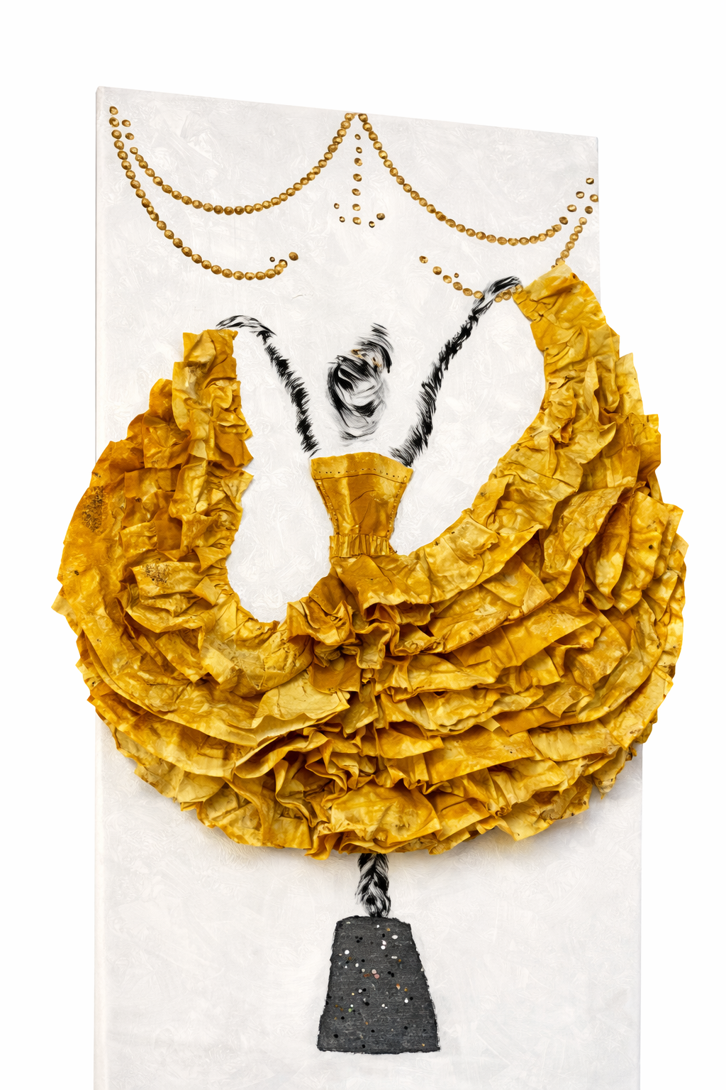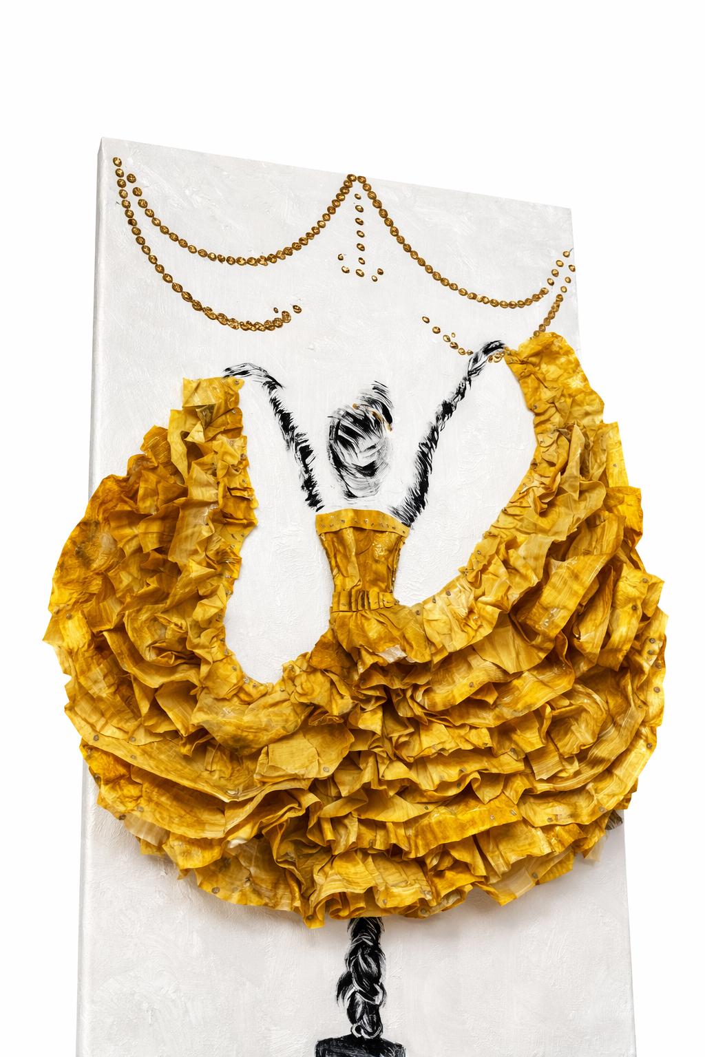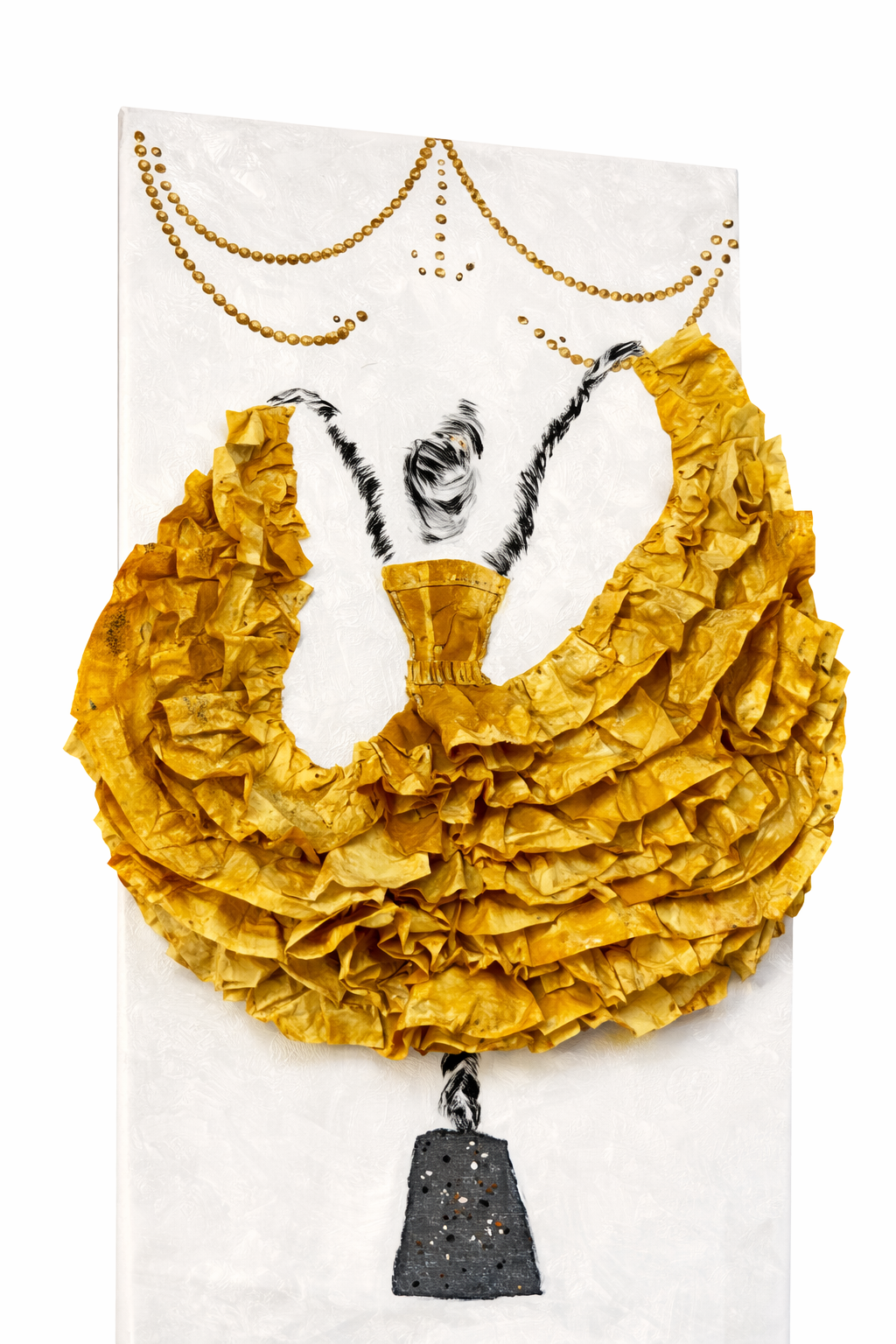 Værket er opbygget i lag af akryl og struktur, hvor den rå overflade skaber kontrast til de bløde, organiske former. Den voluminøse kjole er håndformet i rispapir (mulberry paper), hvis lange fibre giver en levende og naturlig tekstur, som tilfører værket dybde og eksklusivitet.